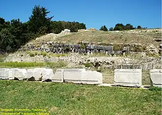 The Campsite Memorial of Augustus, or Octavian's Tropaeum for the Battle of Actium was a victory trophy (tropaeum) built by Emperor Augustus to commemorate his decisive naval victory over Mark Antony and Cleopatra VII at the Battle of Actium in 31 BC. Located on a hill north of Nikopolis, Greece, the monument was part of Augustus' broader efforts to celebrate his triumph and consolidate his political and religious authority. The structure combined military symbolism with religious dedication, prominently displaying bronze rams from the captured enemy ships and reliefs reflecting Augustan propaganda.[1][2]