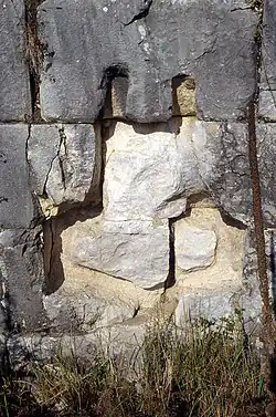 Above the lower terrace, on the massive retaining wall that formed the monument's main façade, there were once at least 36 captured bronze rams on display. Nowadays, only the anchor-shaped sockets that originally held the rams remain on the site. The rams were arranged by size, with the largest at the western end.[1] They came from various sizes of Hellenistic warships, probably ranging from class four to class ten.[5] The rams were supported by rectangular stone pedestals positioned on the lower terrace about one meter from the second retaining wall.[1] These pedestals contained metal brackets to hold the heavy bronze rams in place. Their locations and the dimensions of the socket shed light on the design of different classes of ancient bronze rams as well as the composition of Antony and Cleopatra's fleet.[6][7][5]