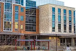 The Stony Brook Union is the main student union on campus, located on John S. Toll Drive. It opened in 1970 as the first building on campus dedicated specifically for student life.[16] In the past, the building was known as the "living room of the campus" and home to facilities including a bowling alley, post office, bookstore and campus dining.[17] It used to be the home of Stony Brook's college radio station WUSB as well as University Café, the last-standing bar on campus.[18] The building closed in 2016 before undergoing a three-year, $63.4 million renovation, reopening in 2020.[16][19] The new Union building is three stories tall, takes up 170,000 square feet and bears modernist and neoclassical architectural styles, with brick, stone, metal and glass finishes. It currently serves over 40 different student and faculty organizations.[16]