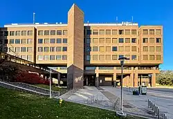 The Chemistry Building is the home of the Chemistry Department as well as the site of the Chemistry Library.[60] It is located at the base of the zebra path, next to the Melville Library. The building opened in 1962 as the Chemistry Laboratory, one of two buildings (along with the Humanities Building) to be completed when Stony Brook University moved its campus to Stony Brook from Oyster Bay. It was renamed to the Chemistry Building in 1983 to reflect its current usage.[57] It is seven stories tall and 170,000 square feet, designed for research and upper-division instructional activities.[61]