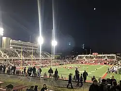 The Kenneth P. LaValle Stadium is the main athletic stadium for Stony Brook's Division I athletic teams, the Seawolves. With a seating capacity of 12,300, it is the largest outdoor facility in Suffolk County. It hosts home games for Stony Brook's football, men's and women's soccer and men's and women's lacrosse teams. It was constructed in 2002 at a cost of $22 million and named after senator Kenneth LaValle, who secured the funding for the stadium.[74] Its most recent expansion came in 2017, when 2,000 seats were added to the north end zone along with a new concessions and restroom facility.[75] A new turf field was installed in 2018.[76] LaValle Stadium has also hosted official NCAA championship games, such as the Final Four of the NCAA Division I Women's Lacrosse Championship in 2012 and 2018.[77][78]