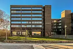The Ward Melville Social and Behavioral Sciences Building is one of the tallest buildings in Stony Brook's West Campus at seven stories tall. It opened in 1977 and was designed by architect Richard Thompson.[57] In 1987, it was renamed after Ward Melville.[46] Numerous departments have offices in the building including Political Science, Economics, and History. The building is split up into north and south wings and is located at the bottom of a hill between the Humanities and Life Sciences building.[58]