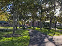 Stony Brook University is the largest residential public school in the state of New York, with nearly 10,000 students choosing to live on campus.[102] While the vast majority of housing is located on Stony Brook's West Campus, residential options are available at the East Campus and Stony Brook Southampton for undergraduate students, graduate students and their families. First-year students are divided into residential communities based on a system of "Undergraduate Colleges" that bring together students of similar interests.[103] In the 1960s, the Stony Brook University administration decided to name its dormitory buildings after the theme of "Great Deceased New Yorkers."[104]