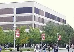 The Frank Melville Jr. Memorial Library is the main library at Stony Brook University's West Campus. It opened in 1963 and was soon expanded, more than quadrupling in size by 1971, when the building was dedicated to Frank Melville Jr., the father of Ward Melville.[13] It is located toward the eastern end of the Academic Mall and houses over two million volumes, ranging from government documents to music and film collections.[14] The building is six stories tall and the entire structure encompasses approximately 682,000 square feet of space. It is in use by over fifty different administrative and academic departments.[15] The Melville Library is also home to retail stores such as Shop Red West, a university bookstore, a Starbucks coffee shop, Amazon@Stony Brook (the first Amazon pickup location in the state of New York) and FedEx.