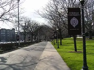 The Rose Hill campus is Fordham's original campus, established in 1841 by bishop John Hughes. It is home to Fordham College at Rose Hill, the Gabelli School of Business, and a division of the School of Professional and Continuing Studies, as well as the Graduate Schools of Arts and Sciences and Religion and Religious Education. It is the largest of Fordham's three campuses, comprising 85 acres (34.4 ha)[2] in the central Bronx; it is also among the largest privately owned green spaces in New York City, situated just north of the Belmont neighborhood on Fordham Road.[1] The original land comprised 100 acres (40.5 ha), but the university sold 30 acres east of Southern Boulevard to the New York City government to become part of the New York Botanical Garden.[3]