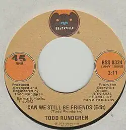 Todd Rundgren released his version on his 1978 album Hermit of Mink Hollow. This was the only hit single on the album, reaching #29 on the US Billboard Hot 100,[1] and also peaking at #8 in Australia and #37 in Canada. The lyrics describe a relationship to which Rundgren and the woman to whom he is singing have made great efforts to fix, but simply cannot make it work. Rundgren explains this, but wishes to part amicably, asking several times if he and his partner can "still be friends." The song is generally assumed to be about Rundgren's breakup with long-time companion Bebe Buell in 1977. Rundgren played all the instruments and performed all the vocals on the track, as he did with the rest of the album.