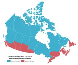 Parts of Northern Canada within the red line are considered to be a part of the Arctic Region according to the average temperature of their warmest month. Political definition of Northern Canada – the "territories" of Canada generally north of the 60th parallel.[3] Barren Grounds and tundra are shown in light blue, and the taiga and boreal forest in dark blue. The three territories and northern portions of seven provinces are defined as northern Canada for northern development purposes by the Conference Board of Canada's Centre for the North, the Northern Development Ministers Forum, and Statistics Canada.[4]