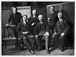 The annual exhibitions organized in Toronto, and in Montreal in 1910, included some of the finest work being produced by Canadian artists. Membership included painters and sculptors and was by invitation only. Edmund Morris and Homer Watson were key figures in its formation and the first exhibition included work by Horatio Walker, working in New York since 1885, and James Wilson Morrice of Paris (since 1890). The members in Toronto in April 1909 are shown in this photograph which is identified and discussed by M. O. Hammond.[a][3] (Back row left to right: Edmund Morris, Archibald Browne, Curtis Williamson. Front row left to right: Phimister Proctor, Horatio Walker, W.E. Atkinson).