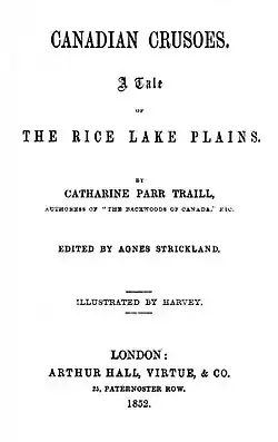 Canadian Crusoes: A Tale of the Rice Lake Plains is a novel by Catharine Parr Traill published in 1852, considered the first Canadian novel for children.[1] Written after The Backwoods of Canada (1836), it is Traill's second Canadian book. It was first published in 1852 by London publisher Arthur Hall, Virtue, and Company. It was edited by her sister Agnes Strickland.