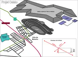 The Canadian Malartic mine is located in Malartic, Quebec, a community about 550 km northwest of Montreal in the administrative region of Abitibi-Témiscamingue. The gold deposit, which extends a couple kilometers along the Cadillac fault and includes porphyry gold has a resource of up to 348 tonnes.[1] Only areas considered to have more than 3g/ton of gold will be mined. Expansion projects near Malartic were considered after favourable drilling results in Southern Barnat.[1] 204 of the 205 homeowners in the area representing about 1/7 of the town's population, were bought out but the 1 remaining tried to use his interest in the area to keep the company from going ahead despite support for it from the mayor who estimates that it will create 880 direct and indirect jobs. In August 2010 a superior court judge awarded the property to Osisko Mining Corporation after determining it was an obstacle for important preparation work at the project.[2] Production at the mine was scheduled to begin in June 2011.[3] The Malartic mine reached commercial production in May/June 2011 after processing averaged 33,300 tonnes (32,800 long tons) per day in the four weeks ended June 17, 2011.[4]