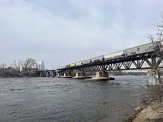 Canadian Pacific Camden Place Rail Bridge is a truss bridge that spans the Mississippi River in Minneapolis, Minnesota. This bridge is the official end of the navigable channel for river traffic.[2][3] It was built in 1905 by the Minneapolis, St. Paul and Sault Ste. Marie Railway. In 1977, the bridge was modified to allow higher clearance under the center span. This was done by replacing the deck truss span with a shallower girder span. It is the main line crossing of the Mississippi River for the Canadian Pacific Railway transcontinental (Soo Line Railroad) line.