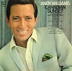 Canadian Sunset is a compilation album by American pop singer Andy Williams that was released in the spring of 1965 by Columbia Records.[4] The cover bears the phrase "formerly titled Andy Williams' Best" underneath the title, suggesting that the same songs can be found here that were on that 1961 release by Cadence Records, but his number one hit "Butterfly" and its top 10 follow-up "I Like Your Kind of Love" that were included on the Cadence album were replaced on this release with the B-sides of two of the other songs here.[5]