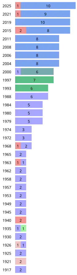 | Election | Liberal | Conservative | New Democratic | Green | People's | PC | Reform / Alliance |