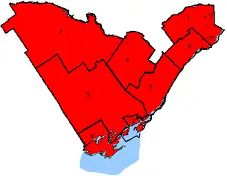 In the 2011 election, the region was affected by the nationwide surge in support for the NDP. Although the NDP failed to win any seats in the area, they increased their popular vote share in all seven of the region's ridings, and won second place in three of the area's ridings.