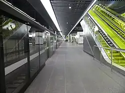 The station is located beneath and within the West India North Dock on an artificial island[10] and extends from east of the Docklands Light Railway bridge to the east end of the dock. It stands within a 475-metre (1,558 ft) long concrete box with a 245-metre (804 ft) long island platform. It is fitted out to 210 m (690 ft) with the potential for extension should the need to operate longer trains arise.[11]