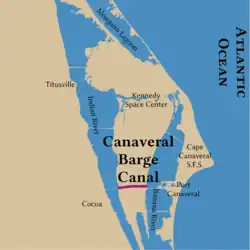 The Canaveral Barge Canal is an active canal in Brevard County, Florida, cutting east-west across northern Merritt Island just south of Cape Canaveral. It connects the Atlantic Ocean and Port Canaveral with the Indian River and wider Indian River Lagoon, part of the Intracoastal Waterway. The canal consists of two segments separated by the Banana River.[2]