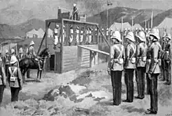 The incident lasted more than four hours.[7] As a result, a part of the city was burnt and according to various estimates, 500 to 800 Christians were massacred by Muslim irregular groups.[4][2] The massacre ended only when British warships began bombarding the city.[2] Meanwhile, the responsible Ottoman officer, Ismail Pasha, contacted French Counter-admiral Édouard Pottier, the head of the international force, and offered to provide a half-battalion in support to the British forces to quell the disturbance. However, it was later revealed that Ismail's subordinate, the local Ottoman ruler (kaymakam) Ethem Pasha, was himself involved in the outbreak of the violence.[4]