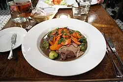 Glazed carrots are not as common as they once were. Slate.com wrote of them: "Glazed carrots have a slightly fusty, mid-century vibe about them, as though they'd feel right at home sitting on a table next to meatloaf and Jell-O salad ... But they're hardly obsolete".[7] Some scholars have noted that foods like "glazed carrots" and "scalloped potatoes" are frequently served at informal meals as vegetable sides for foods, such as "Hungarian goulash", that remain attached to certain ethnic identities while also part of American cuisine.[8]