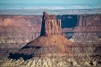Candlestick Tower is a 450-foot-tall (140 m) sandstone butte located in the Island in the Sky District of Canyonlands National Park, in San Juan County, Utah.[3] Its descriptive name comes from its resemblance to a candlestick. Candlestick Tower is composed of Wingate Sandstone, which is the remains of wind-borne sand dunes deposited approximately 200 million years ago in the Late Triassic.