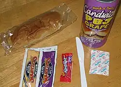 As of November 2011, the only flavor available is "Peanut Butter and Jelly - Grape", although the website claims that "Peanut Butter and Jelly - Strawberry" and "Barbecue Chicken" will be offered.[8] Other potential ideas included pepperoni pizza pocket, French toast, and cinnamon rolls.[5] A can of "Peanut Butter and Jelly - Grape" can contains "a small hoagie roll, a packet of peanut butter, a packet of jelly, a plastic knife and a handi-wipe" and a piece of Laffy Taffy.[8][9] The Candwich had a one year shelf life.[10] As of 2011, the Candwich was available online and at 7-11 stores in Salt Lake City, Utah.[8] Starting September 15, 2016, Candwich could be pre-ordered via a crowdfunding campaign on Indiegogo.[11] In 2021, the Candwich underwent a relaunch, announcing they were now available to purchase from vending machines in the locale.[12] They also rebranded as Mk1 Foods Corp.