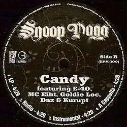 "Candy (Drippin' Like Water)" is the third single by Snoop Dogg from his 2006 album Tha Blue Carpet Treatment, produced by Rick Rock. It features E-40, MC Eiht, Goldie Loc and Tha Dogg Pound (Daz Dillinger and Kurupt), and Ladybug on the chorus. The song title and sample come from Ladybug Mecca's vocals on Digable Planets's "9th Wonder (Blackitolism)". "Candy" refers to a high gloss paint finish applied to automobiles. In the song it is also used as a euphemism for marijuana, cocaine and sex.