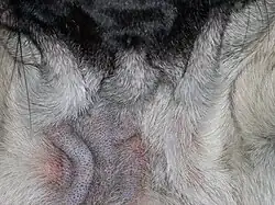 Canine demodicosis is a common parasitic skin disease in dogs caused by the excessive proliferation of the hair follicle mite Demodex canis. It can occur locally or all over the body. Demodicosis in older animals only occurs in connection with disorders of the immune system, in young animals the development of the disease is not fully understood. Demodicosis usually begins with hair loss and without itching. As the disease progresses, a secondary bacterial infection can lead to severe skin changes up to purulent skin inflammation (pyoderma). The disease is detected by microscopic detection of mites. Treatment is carried out with mite-effective medication.[1]