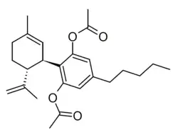 Cannabidiol diacetate (CBD-di-O-Acetate, CBD-DO) is a semi-synthetic derivative of cannabidiol derived by acetylation of the OH groups,[1] which presumably acts as a prodrug for CBD. It has been found as a component of grey-market cannabis products such as e-cigarette liquids and cannabis infused foods.[2]