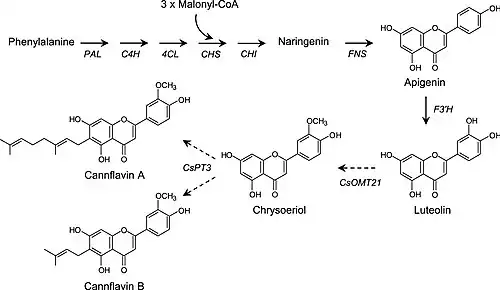 Cannflavins A and B are biosynthesized by prenylation of chrysoeriol.[5]