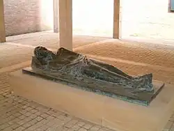The entrance building contains toilets for visitors and a visiting room where the cemetery register is available on request. A plan of the plots within the cemetery is also on display. From here a small courtyard with a covered passage forms the connection to the Hall of Honour, which has at its centre, resting on a large block of stone, a bronze sculpture of a fallen warrior, by the eminent German sculptor, Professor Hans Wimmer.[2][3] Open passageways give a clear view of two terraces. On the west-facing terrace there is a granite monument to the crews of the four airships (SL 11, L32, L31, L48) shot down in World War I and who lie buried here in a tomb in separate sarcophagi.[3]