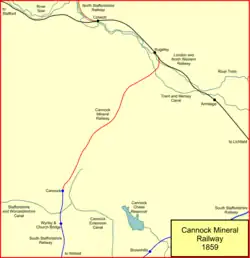 The Cannock Mineral Railway was a railway company that built a line from Cannock (Staffordshire,) to join the London and North Western Railway (LNWR) at Rugeley, in England. It was conceived and authorised as the Derbyshire, Staffordshire and Worcestershire Junction Railway, with the intention of connecting Dudley and Uttoxeter, but it was hopelessly undercapitalised and badly managed.