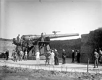 ![]() Journalists inspecting a 15-inch Cannone navale da 381/40 along the Adriatic coast | |