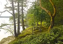 Canoe Island is a 47-acre (19-hectare) island located in the center of the San Juan Islands, an archipelago in the U.S. state of Washington.[1] The island is situated in Upright Channel between Shaw and Lopez Islands. Canoe Island's surface is mostly forested with second-growth cedar, fir, hemlock, and madrona, with some old-growth trees, too. Its maximum elevation is 127.7 feet (38.9 metres). The rocky shoreline is bordered by dense forests of bull kelp.[2]