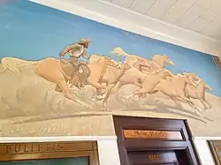 The area in which the post office is situated was once called Owensmouth, and there were two post offices for the town. In 1931, the name was changed to Canoga Park and the post offices merged, resulting in the Canoga Park Post Office in 1938. In 1941, Maynard Dixon provided a mural, "Palomino Ponies," for the location. It was his last public mural and was designated as a National Historic Landmark by the National Historical Society.[1][2]