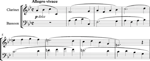 An example of a classical strict canon is the Minuet of Haydn's String Quartet in D Minor, Op. 76, No. 2.[12] "Throughout its sinewy length, between upper and lower strings. Here is the superbly logical fulfilment of the two-part octave doubling of Haydn's earliest divertimento minuets":[13]