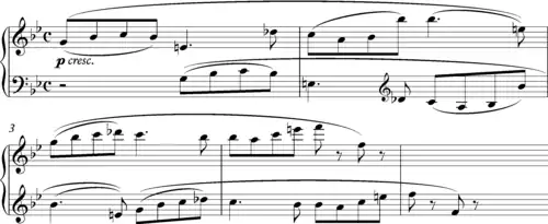 Antony Hopkins describes the above as "a delightfully naïve canon".[14] More sophisticated and varied in its treatment of intervals and harmonic implications is the canonic passage from the second movement of his Piano Sonata 28 in A major, Op. 101: