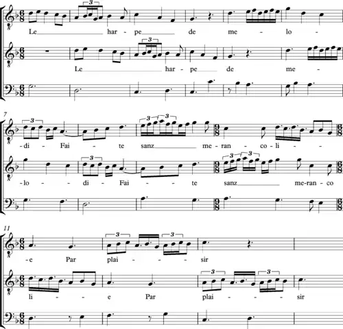 An example of late 14th century canon which featured some of the rhythmic complexity of the late 14th century ars subtilior school of composers is La harpe de melodie by Jacob de Senleches. According to Richard Hoppin, "This virelai has two canonic voices over a free and textless tenor."[10]
