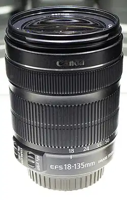 The Canon EF-S 18–135mm lens is a standard to short telephoto telezoom for Canon digital single-lens reflex cameras with an EF-S lens mount. The field of view has a 35 mm equivalent focal length of 29–216mm. With its 7.5× zoom range, it is placed into the superzoom category. Canon offers further lenses with even higher zoom ranges, such as the EF-S 18–200mm lens (11× zoom range).