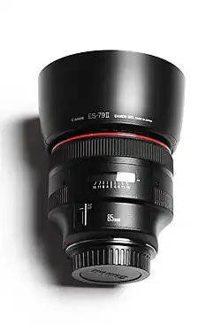 The Canon EF 85mm f1.2L II USM, with its included hood in place
