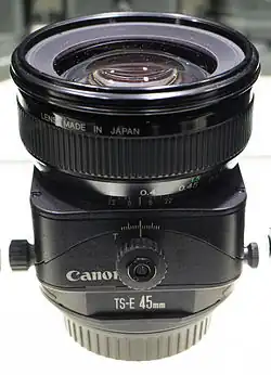 The Canon TS-E 45 mm f/2.8 is a tilt-shift, normal prime lens that provides the equivalent of the corresponding view camera front movements on Canon EOS camera bodies. Unlike most other EF-mount lenses, it does not provide autofocus.