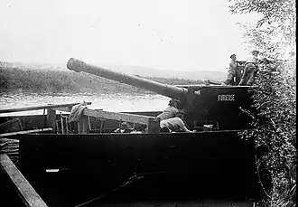 A number of mle 1884 guns were modified to become railway artillery under the designation Canon de 140 sur affut-truc mle 1884 during 1914. The conversion entailed mounting the gun carriage on a simple flatbed rail wagon built from steel I beams and timbers with five variable gauge axles that allowed the guns to transition from standard gauge 144 cm (56.5 in) to narrow gauge 61 cm (24 in) allowing the guns to be brought closer to the front.[4][1]
