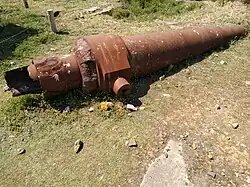 The remains of one of six 194 mm guns on the island of Cézembre (France), destroyed by Allied bombing in August 1944. -