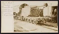 The carriages consisted of a large rectangular steel base, which was suspended on two four-axle railroad bogies manufactured by Schneider.[2] The number of axles was determined by the weight limit for European railways of 17 tonnes per axle.[3] Rather than having a separate ammunition wagon the guns featured a one- piece design where the breach of the gun and its ammunition were combined in an armored cab on the rear bogie. This was intended to give the gun crews protection from shell splinters and gunfire but the cab was cramped and lacked ventilation. This also restricted the angle of elevation to +25° and limited the range of the guns to 22 km (14 mi).[2]