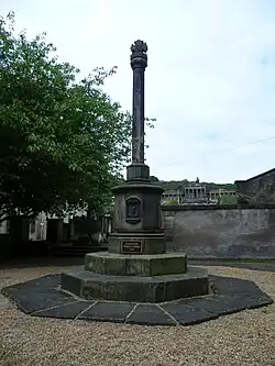 The ancient Mercat Cross (Market Cross) or Burgh Cross is shown on Gordon of Rothiemay's 1647 plan as being in the middle of the road nearly opposite the tolbooth. Gordon shows it as being similar to the Edinburgh Mercat Cross with the shaft and cross mounted on a stone gallery.[36] The much-altered cross now stands in the south-east corner of Canongate Churchyard to the right hand side of the entrance to Canongate Kirk.
