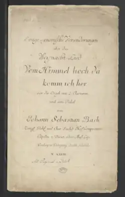 Einige canonische Veraenderungen über das Weynacht-Lied: Vom Himmel hoch da komm ich her, vor die Orgel Mit 2. Clavieren und dem Pedal von Johann Sebastian Bach Königl: Pohl: Und chur Saechss: Hoff Compositeur Capellm. u. Direct. Chor.Mus. Lips. Nürnberg in Verlegung Balth: Schmids.