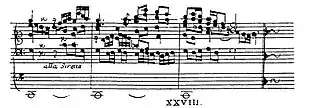 At the conclusion of Variatio IV, above the fourth line of the cantus firmus, the right hand weaves an elaborate coloratura line. In the middle parts the slower dragging Bach motif comes to a climax:[28] the alto voice plays the motif B-A-C-H in the last quavers of bar 39, and then, in the four semiquavers with an upbeat on bars 40–41, the backwards (or retrograde) motif H-C-A-B. Bach further enhances the musical material by closing the final bars with the Comes canon of Variatio IV, essentially the same initial bars as the starting Dux canon of Variatio I.[27] At the peaceful coda, elegiac piping motifs are repeated over a pedal point.[28] As Williams (2003) describes, the closing passages of Variatio IV reflect Bach's "immense motivic ingenuity", which in bar 39 contains "one of the best bars in the whole of P 271".[28][27][29]
