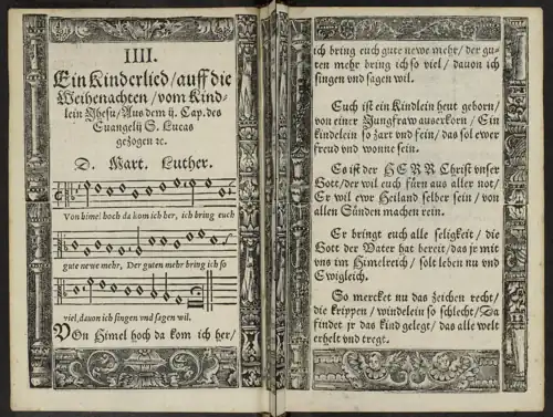 Below are the first, second and last (fifteenth) verses of the Christmas hymn Vom Himmel hoch, da komm ich her by Martin Luther, published in 1539, with the English translation from 1855 of Catherine Winkworth.[15][16]