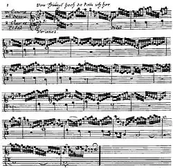 Various stylistic elements in the Canonic Variations recall the compositions of Bach's predecessors and contemporaries. The running figures in the first variation can be found in Toccata No.12 of Georg Muffat (1690) and in the keyboard sonatas of Domenico Scarlatti. The canon in the second variation is close in spirit to the Canons Mélodieux for two instruments of Georg Philipp Telemann. The galant figures of the free line in the third variation are similar to those promoted by Joachim Quantz in his 1752 treatise on flute playing. The elaborate ornamentation of the fourth variation uses many devices from his son Carl Philipp Emanuel Bach's treatise on keyboard technique (1753, 1762); the final pedal point harks back to those of the chorale preludes of Dieterich Buxtehude, for example in his setting of "Durch Adams Fall ist ganz verdebt", BuxWV 183. The walking pedal-bass beneath the canon at the beginning of the fifth variation is similar to Georg Friedrich Kaufmann's setting of "Vom Himmel hoch" in his Harmonische Seelenlust (c. 1733).[8][9]