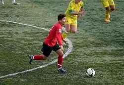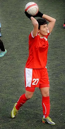 Already at the age of 14 and still living in Germany, she was selected to the Turkey girls' U-15 national team, and travelled for this reason to Turkey to take part at the training camps and international matches.[11] After playing in the national U-17 and U-19 teams, she was admitted to the Turkish women's national team in 2006.[4][5][6][8][9] She had preferred to play for the Turkey national rather than for the German.[24] Cansu Yağ played at the 2008 UEFA Women's U-19 Championship First qualifying round matches against the teams from Poland, Austria and Bulgaria, scoring a goal in the last match.[7] In the UEFA Women's Euro 2009 qualifying match against Georgia, she shot one of the nine goals.[25] Yağ scored two goals against Malta and one goal against Austria in the 2011 FIFA Women's World Cup qualification – UEFA Group 5 matches in April 2010.[26][27]