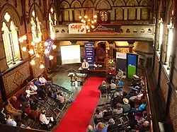 The buildings were substantially damaged in the February 2011 Christchurch earthquake.[7] The stone tower on Armagh Street, which acted as the buildings' entrance on their north side and which held the clock of the Victoria Clock Tower in the early years, collapsed.[8] Dr Ian Lochhead, Associate Professor of Art History at the University of Canterbury, said that the Stone Chamber was for many the single biggest heritage loss of the February earthquake. Lochhead, who was an advisor for the restoration of the buildings from 1981, called for the reconstruction of the Stone Chamber.[9] Detailed engineering assessments showed that the buildings received so much damage that significant portions would have to be rebuilt. A report was due to be given to Christchurch City Councillors in June 2013 outlining the options.[10]