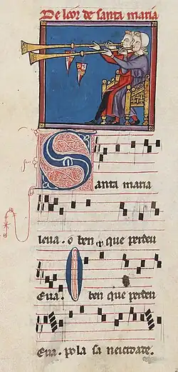 The Cantigas de Santa Maria (Galician: [kanˈtiɣɐz ðɪ ˈsantɐ maˈɾi.ɐ], Portuguese: [kɐ̃ˈtiɣɐʒ ðɨ ˈsɐ̃tɐ mɐˈɾi.ɐ]; "Canticles of Holy Mary") are 420 poems with musical notation, written in the medieval Galician-Portuguese language during the reign of Alfonso X of Castile El Sabio (1221–1284). Traditionally, they are all attributed to Alfonso, though scholars have since established that the musicians and poets of his court were responsible for most of them, with Alfonso being credited with a few as well.[1]